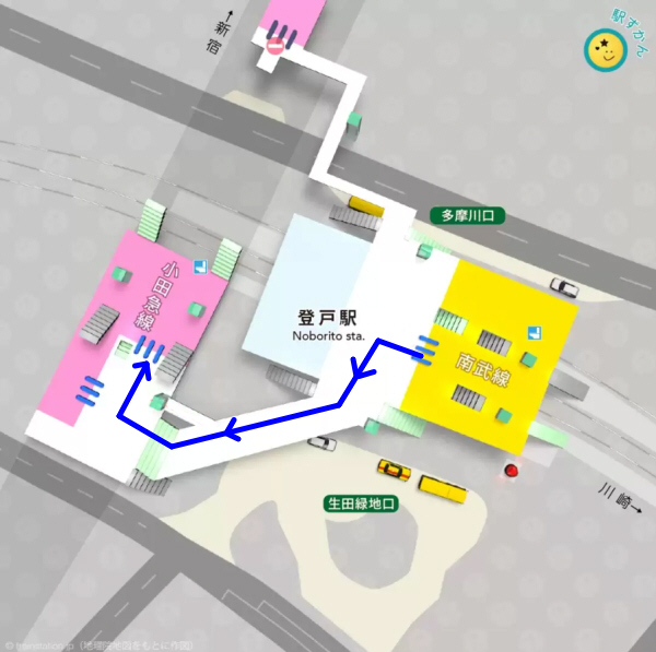 「経堂」駅(各駅停車で7駅目、準急で2駅目)で下車、乗場から下に降りて改札口は1か所です。