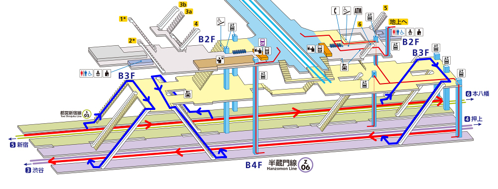 降りたら前方か後方のエレベーターか階段を上り「半蔵門線」の3番ホームの階段を見つけてください。