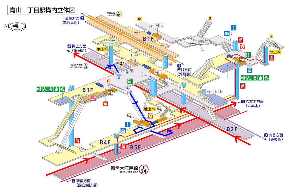「半蔵門線」が地下2階、「大江戸線」が地下5階になります。