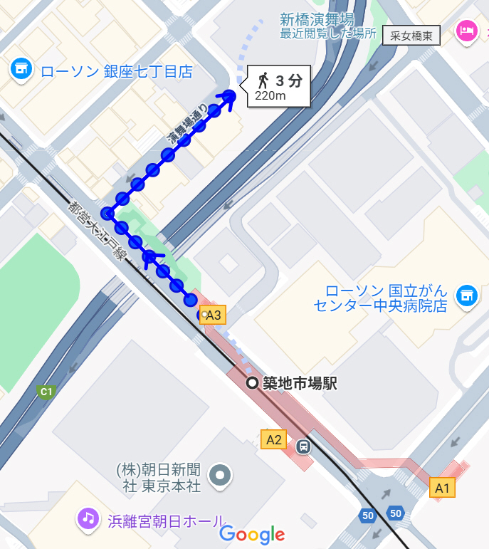 6番目の停車駅(約14分)の「築地市場」駅で下車します。