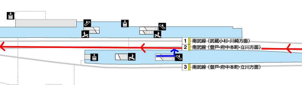 階段を降りて、JR南武線「立川方面」行(2番線)の電車に乗ります。