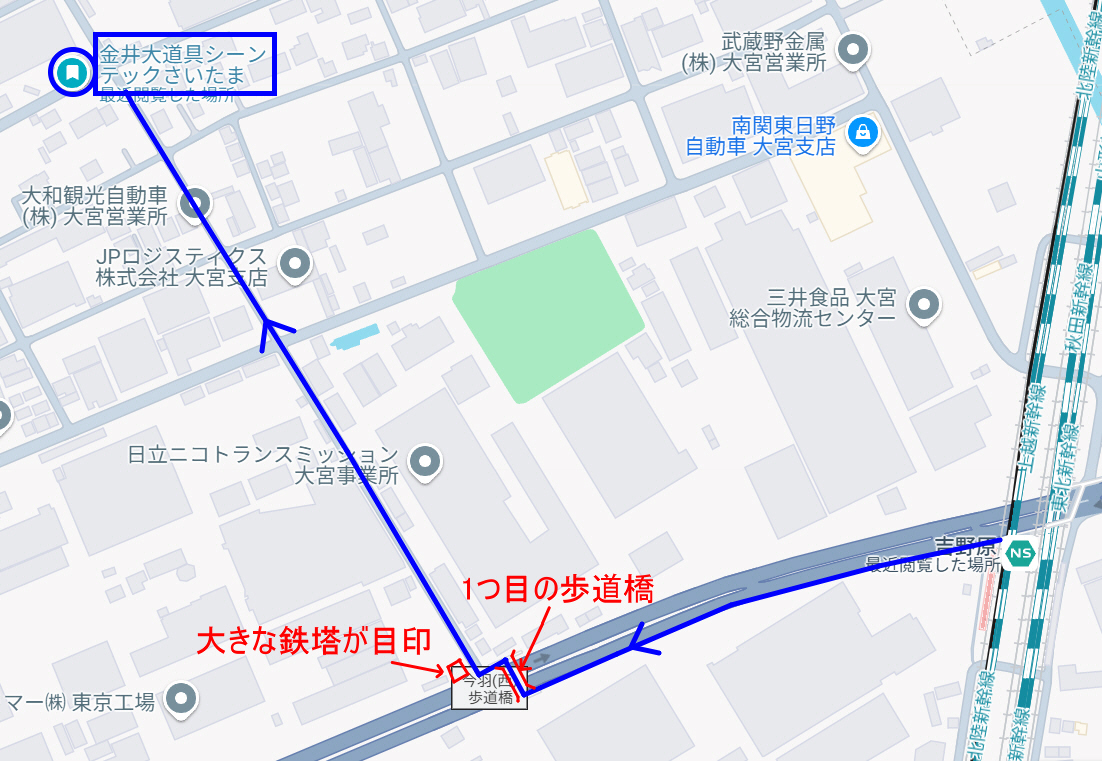 歩道橋を降りてすぐ鉄塔のある道を右方向に進み後はまっすぐ進みます。