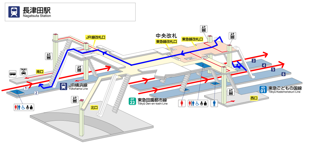 急行・準急で5駅目(約16分)、各駅停車で12駅目(約26分)の「長津田」駅で下車です。
